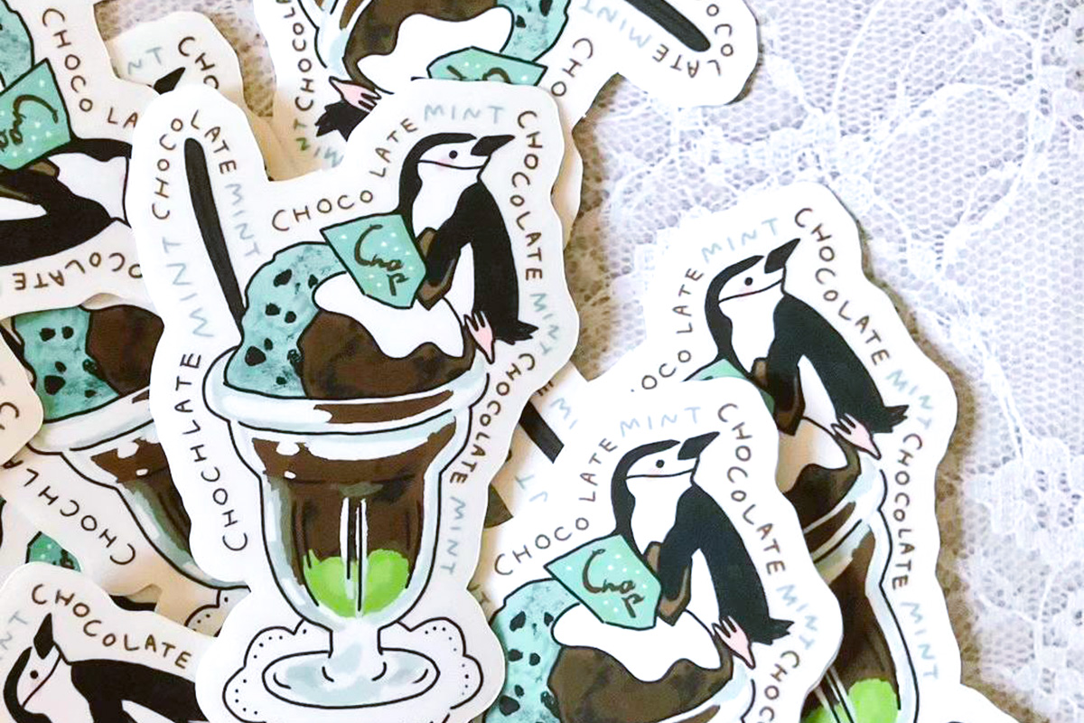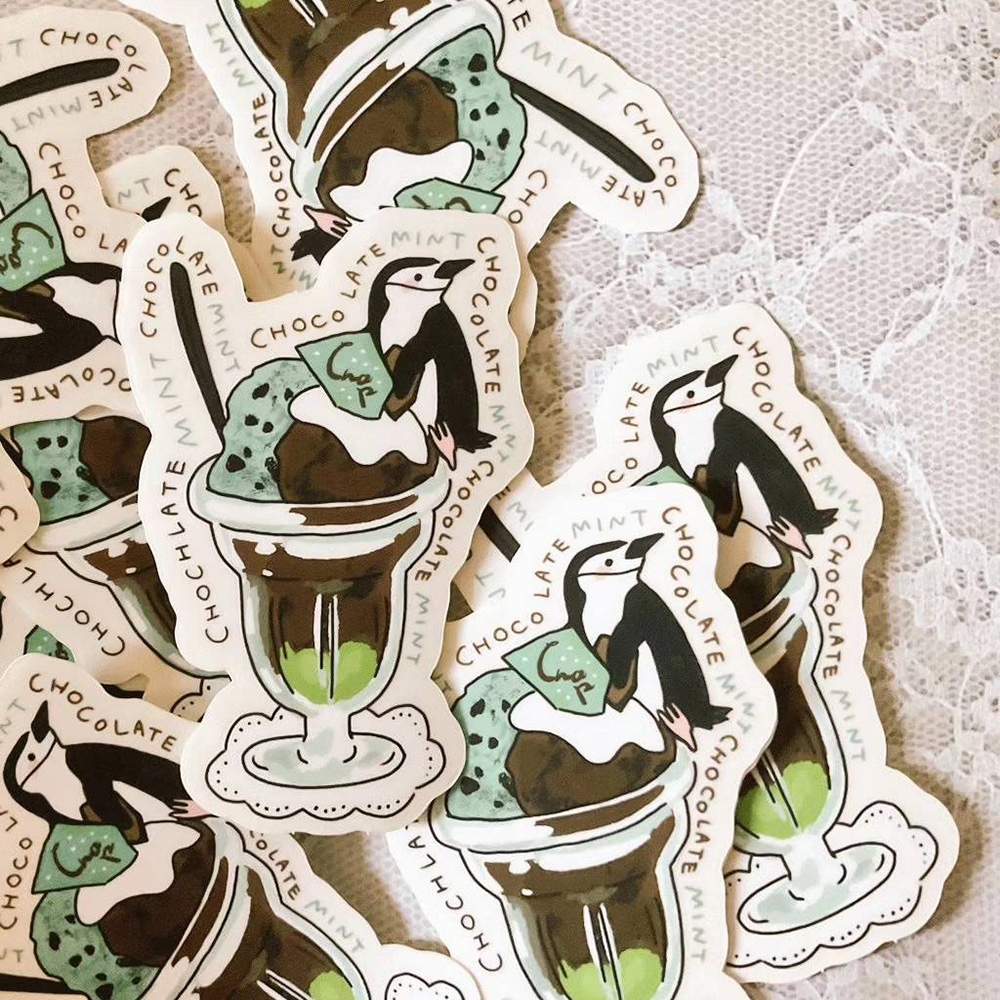 \チョコミン党必見/チョコミントパフェ×ヒゲペンギンのステッカー。耐水性・対光性素材でつかう場所を選びません。スマホケースにも入ります。