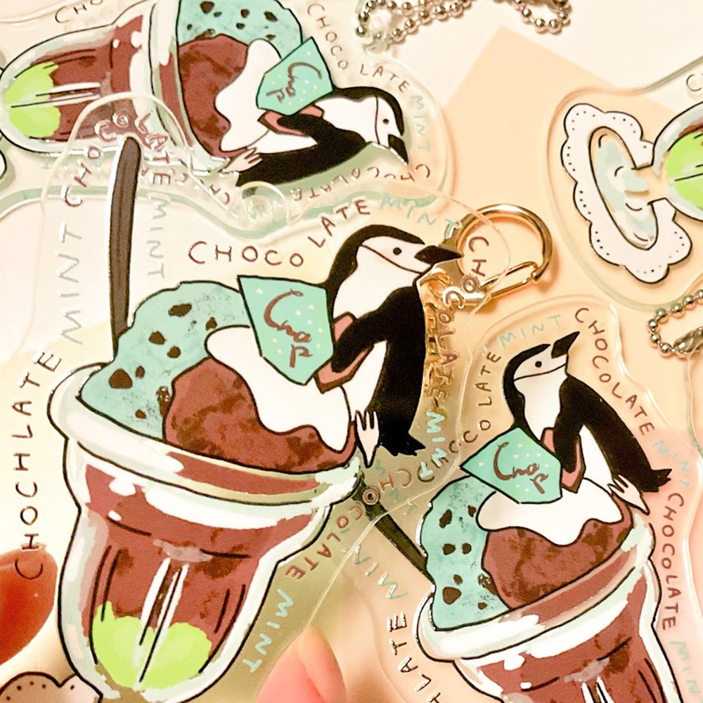 アクリルキーホルダー。 レトロなパフェグラスをイメージした青みを帯びたアクリルカラーにもご注目ください。