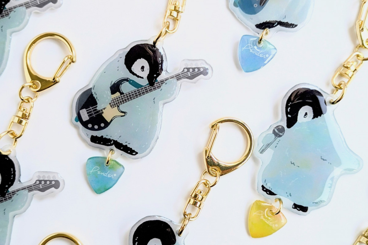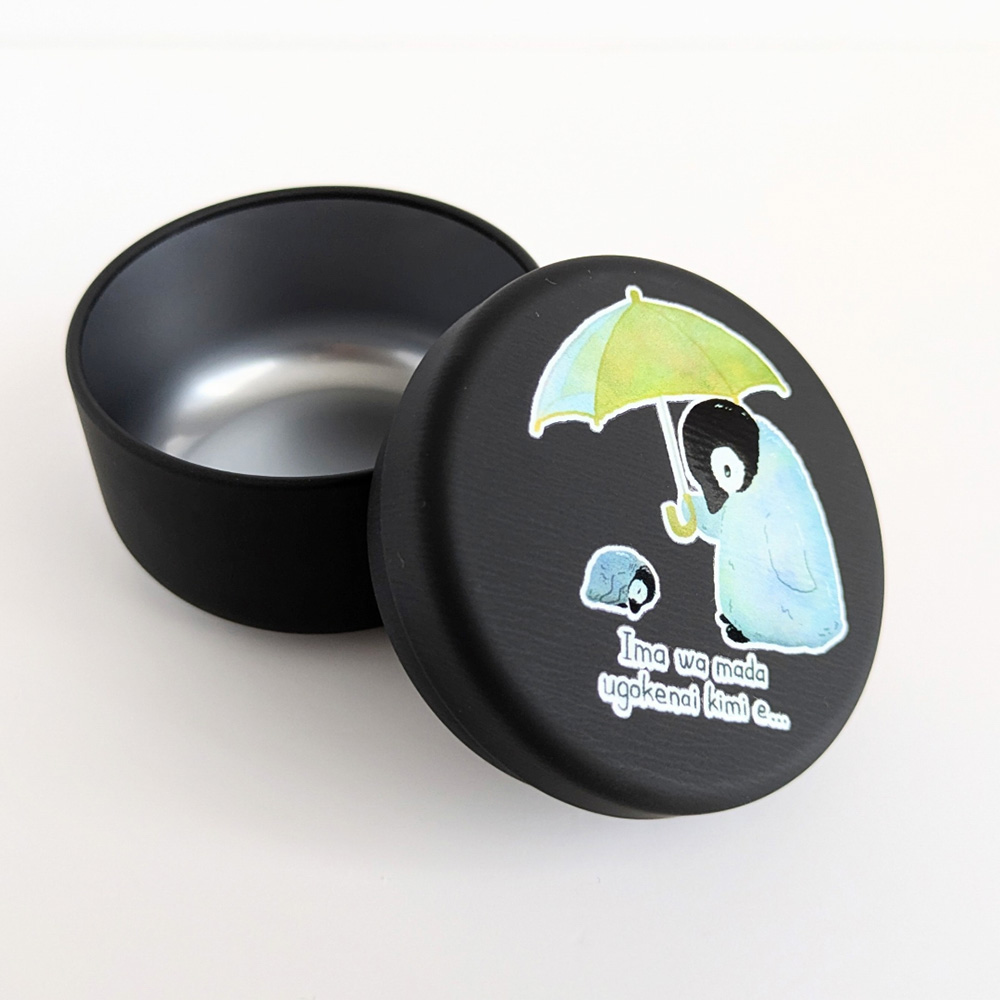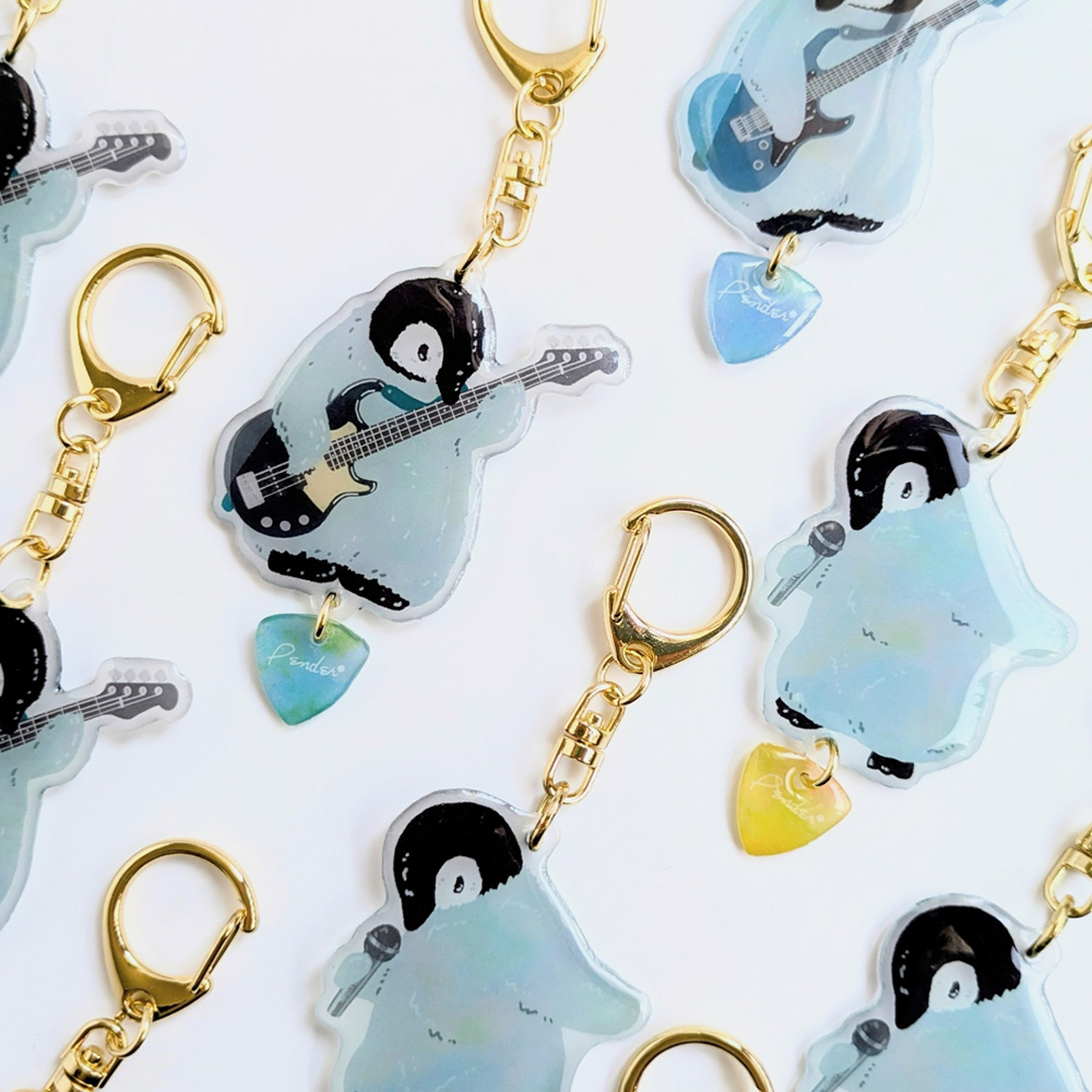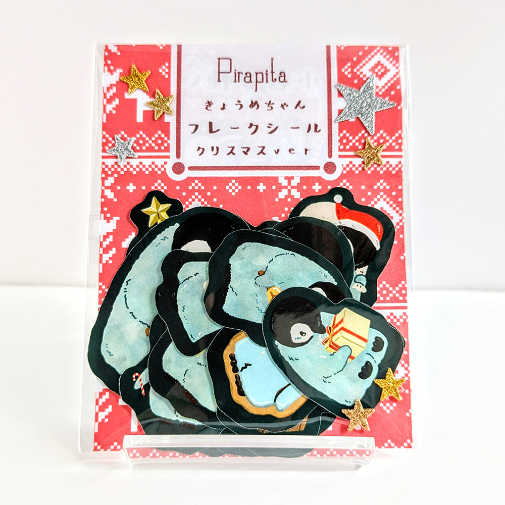 うつむいているコウテイペンギンのオリジナルキャラクター「きょうめちゃん」のハンドメイドキーホルダーや、フレークシール、カレンダー、缶ケースなどです。