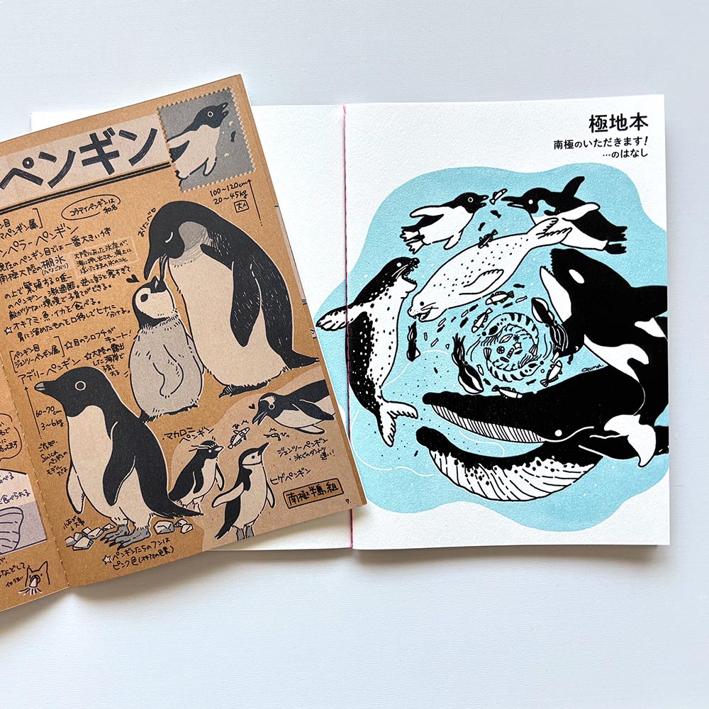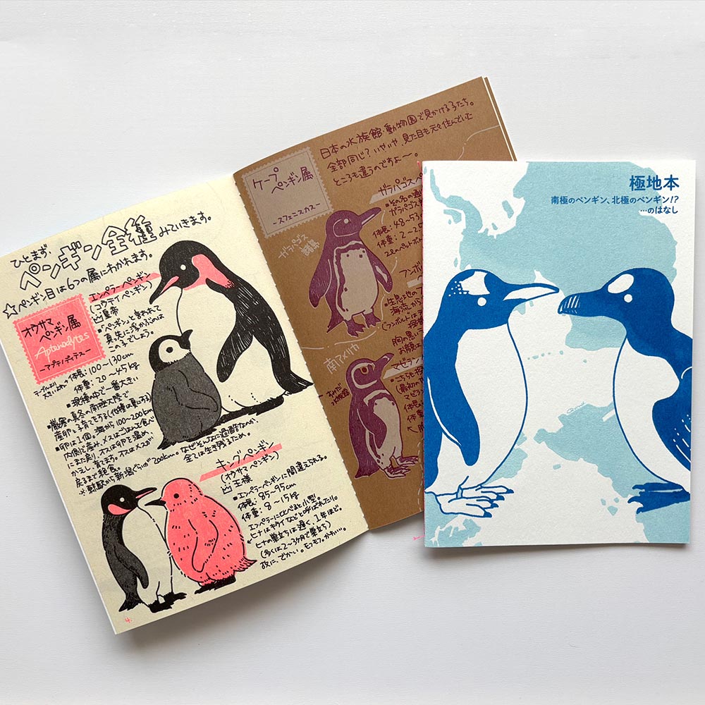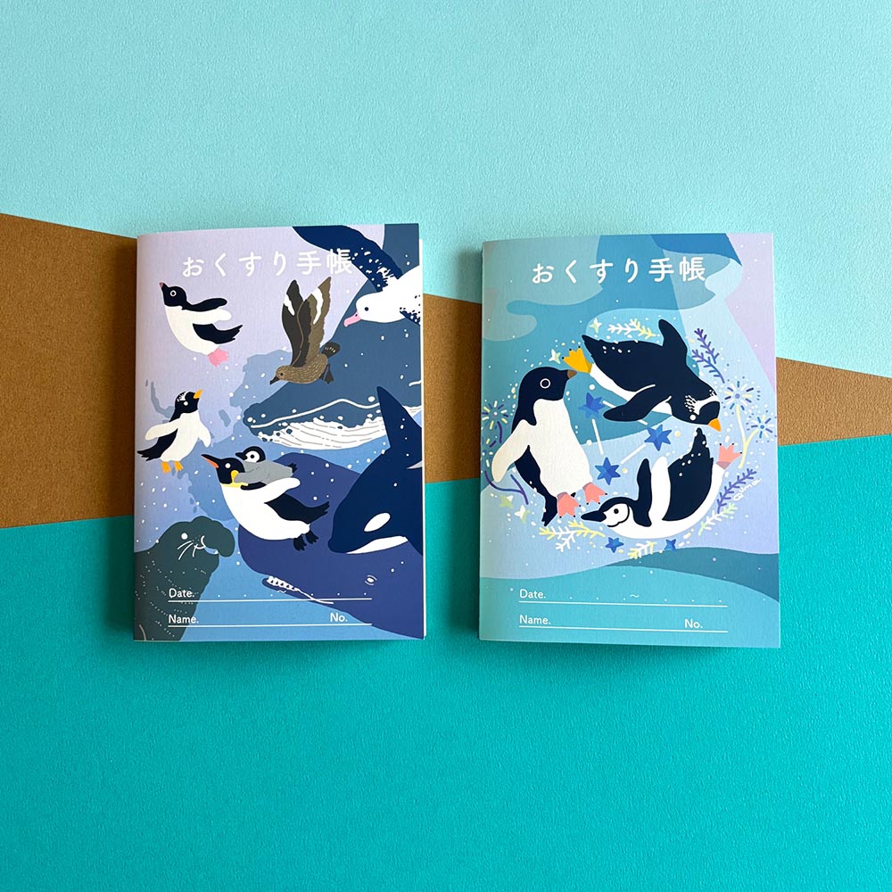ペンギンたちとその周りの生き物や生息地をモチーフにイラストを描き、ステーショナリーや、シルクスクリーンで手刷りしたバッグ、キーホルダーなどの作品にしています。 毎回人気のおくすり手帳やパスワード帳、ネックストラップなど、あると便利なものまで揃っています。