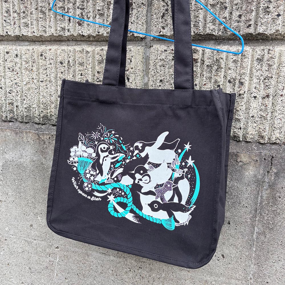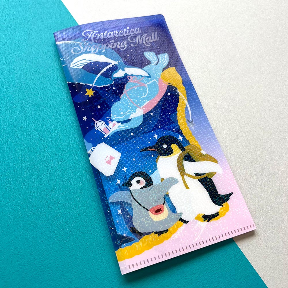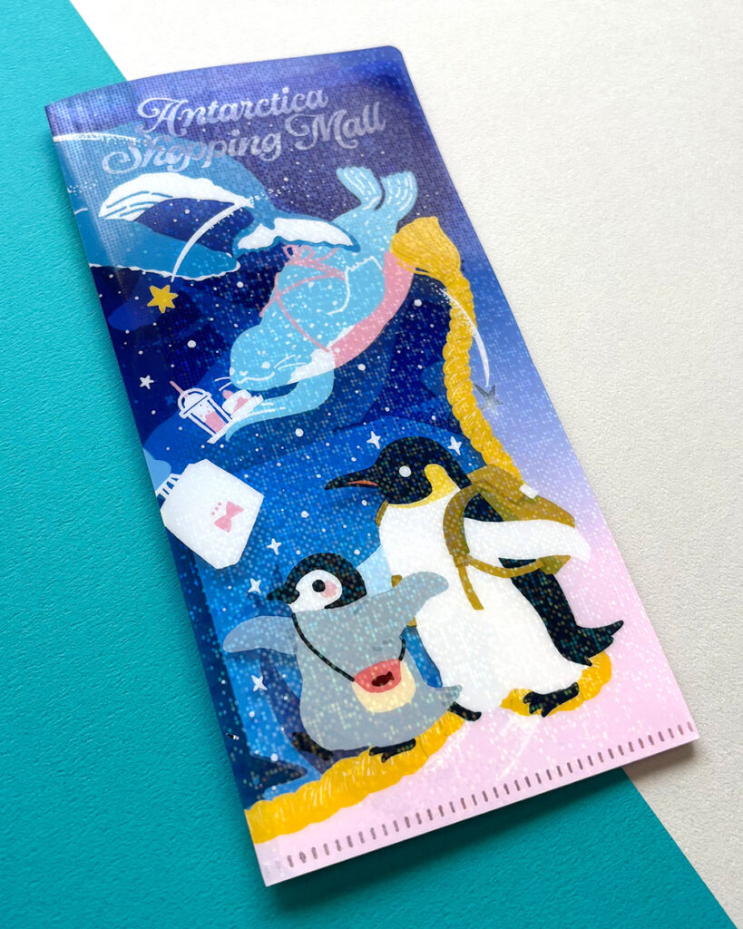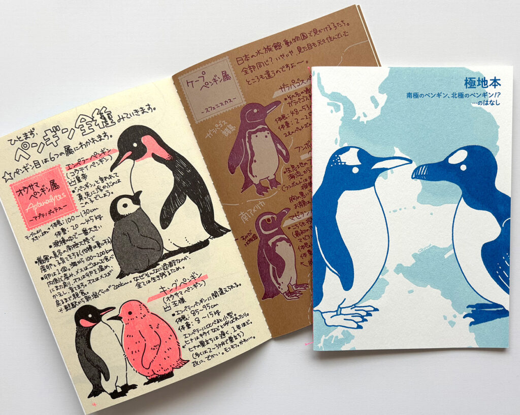 ペンギンたちとその周りの生き物や生息地をモチーフにイラストを描き、ステーショナリーや、シルクスクリーンで手刷りしたバッグ、キーホルダーなどの作品にしています。 毎回人気のおくすり手帳やパスワード帳、ネックストラップなど、あると便利なものまで揃っています。