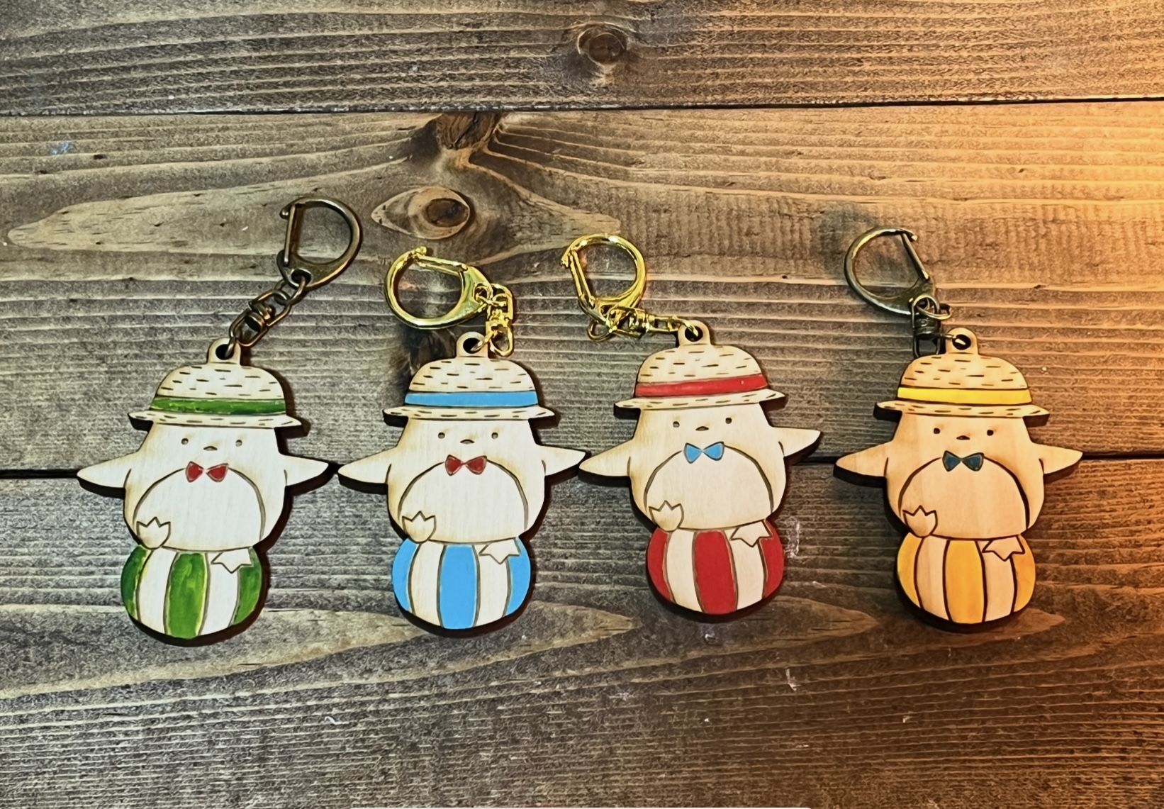小さなキャンバスに描いた原画、手塗りのウッドキーホルダー、ポストカードなど
