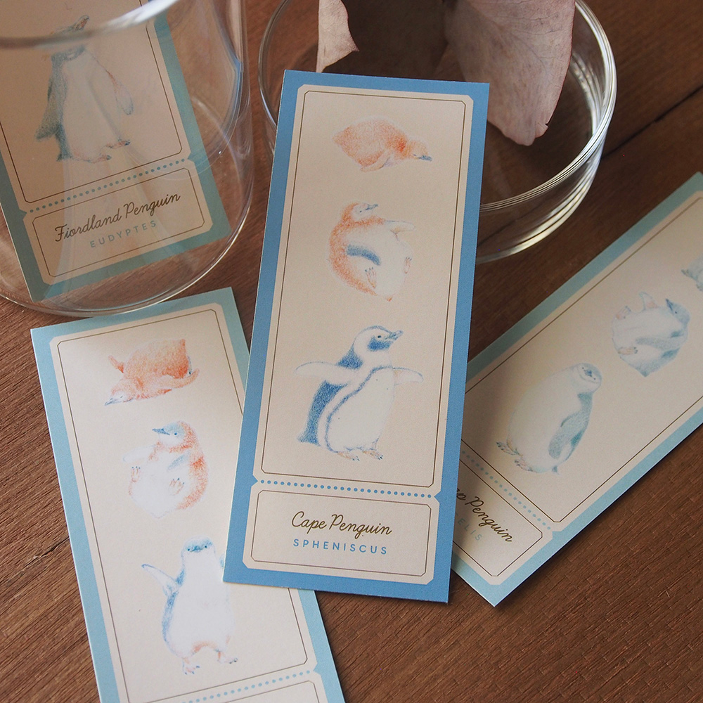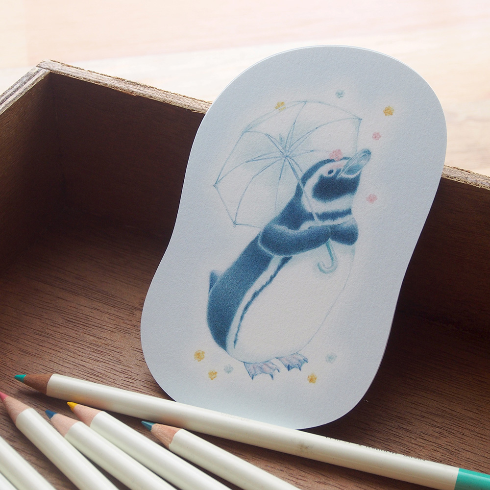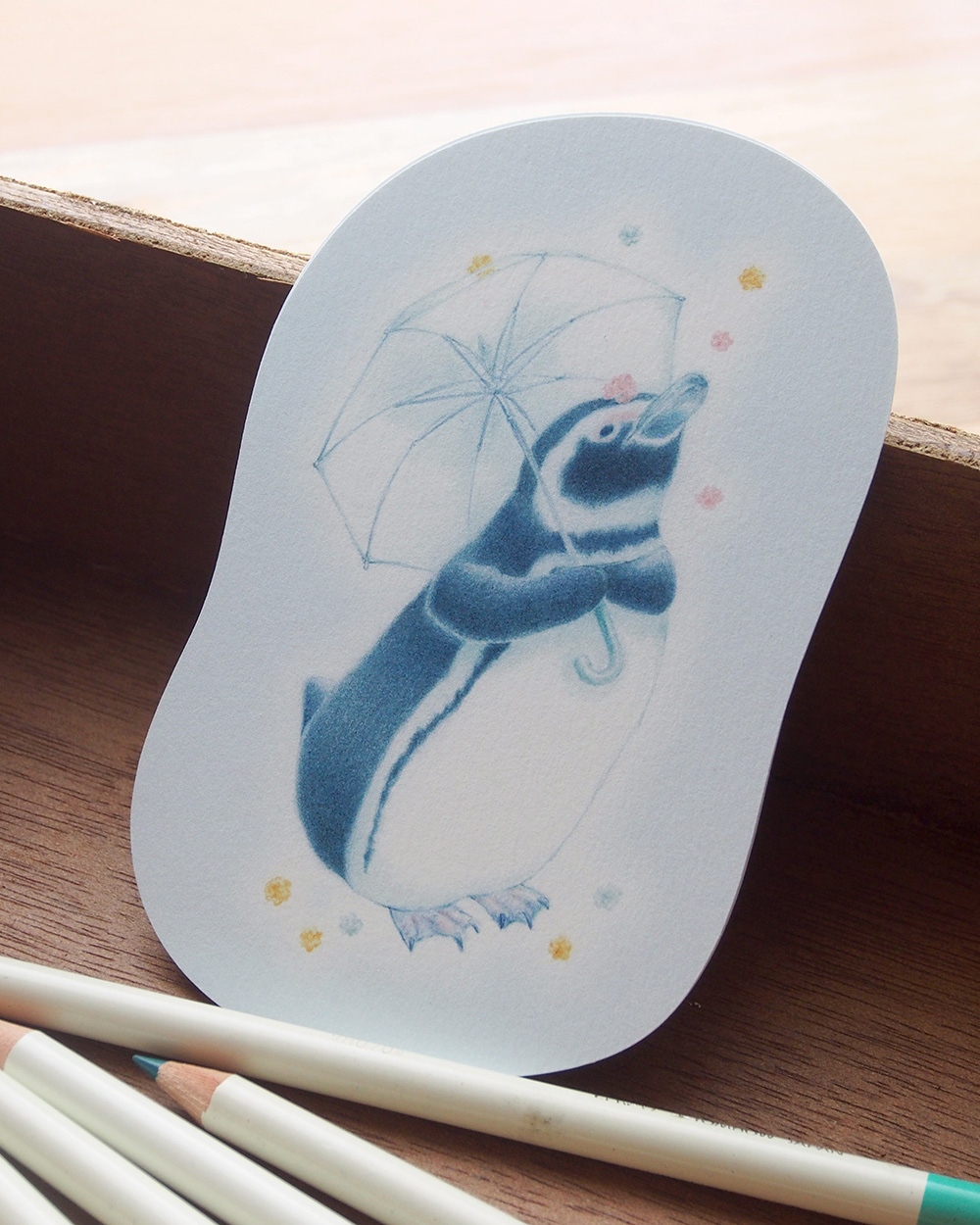 色鉛筆で描いたポストカードや小さな原画など暮らしのとなりにペンギンさんを添えられるような商品を販売します。