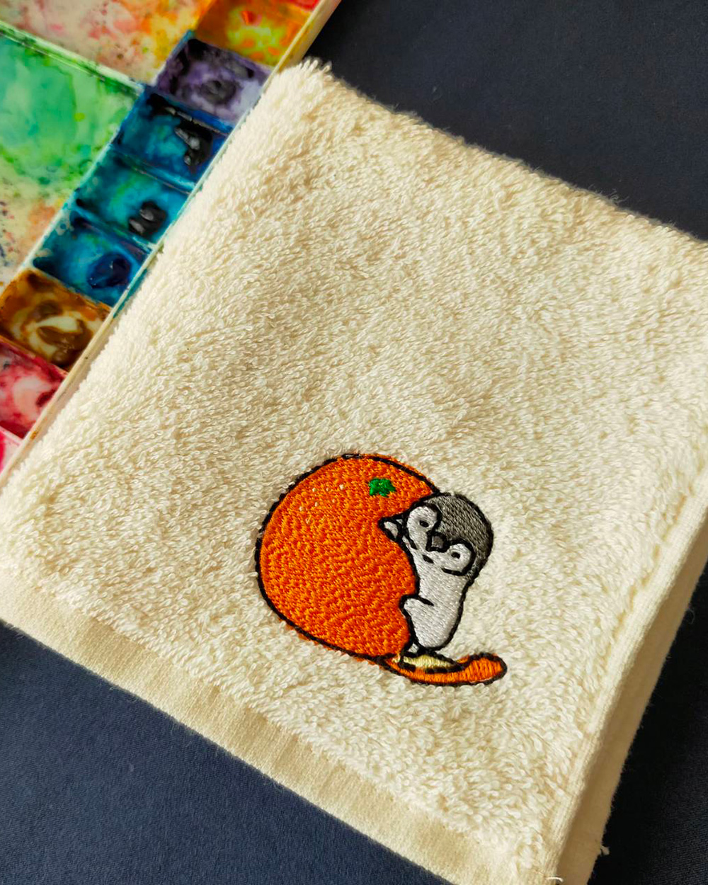 ペンギンとみかんをモチーフにした刺繍タオルハンカチです。