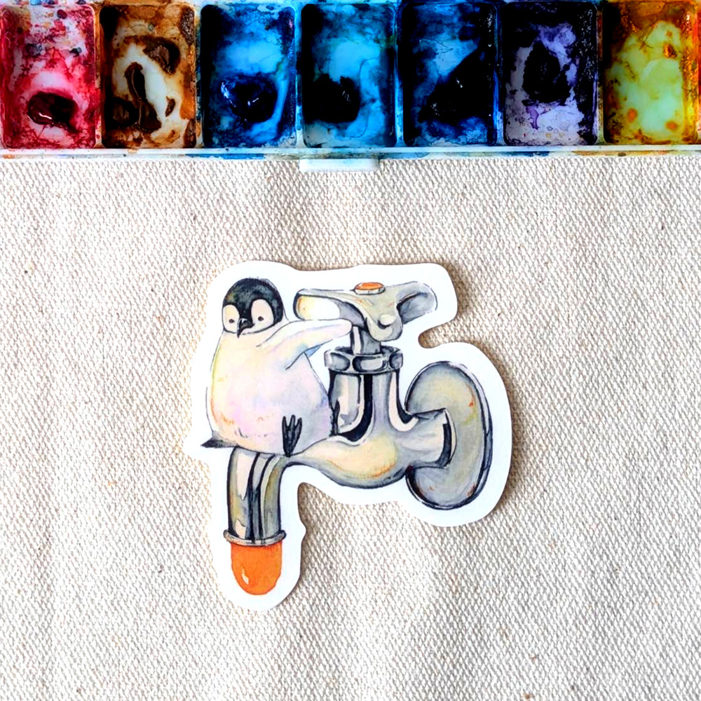 ペンギンとみかんジュースの蛇口をモチーフにした耐水ステッカーです。