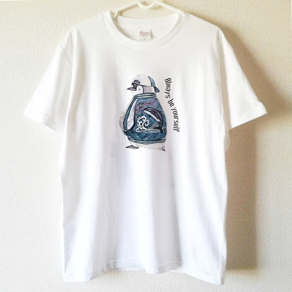 スカジャンを着ているペンギンのTシャツです。