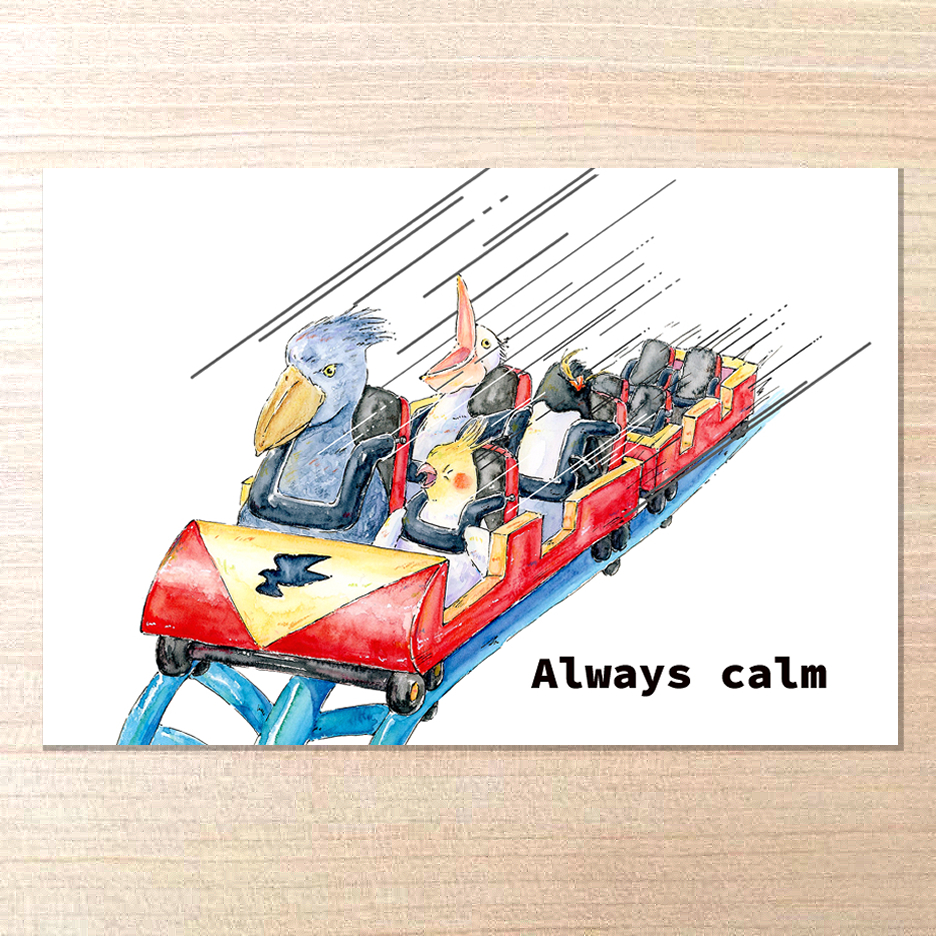 ハシビロコウと鳥たちがジェットコースターに乗っているポストカードです。
