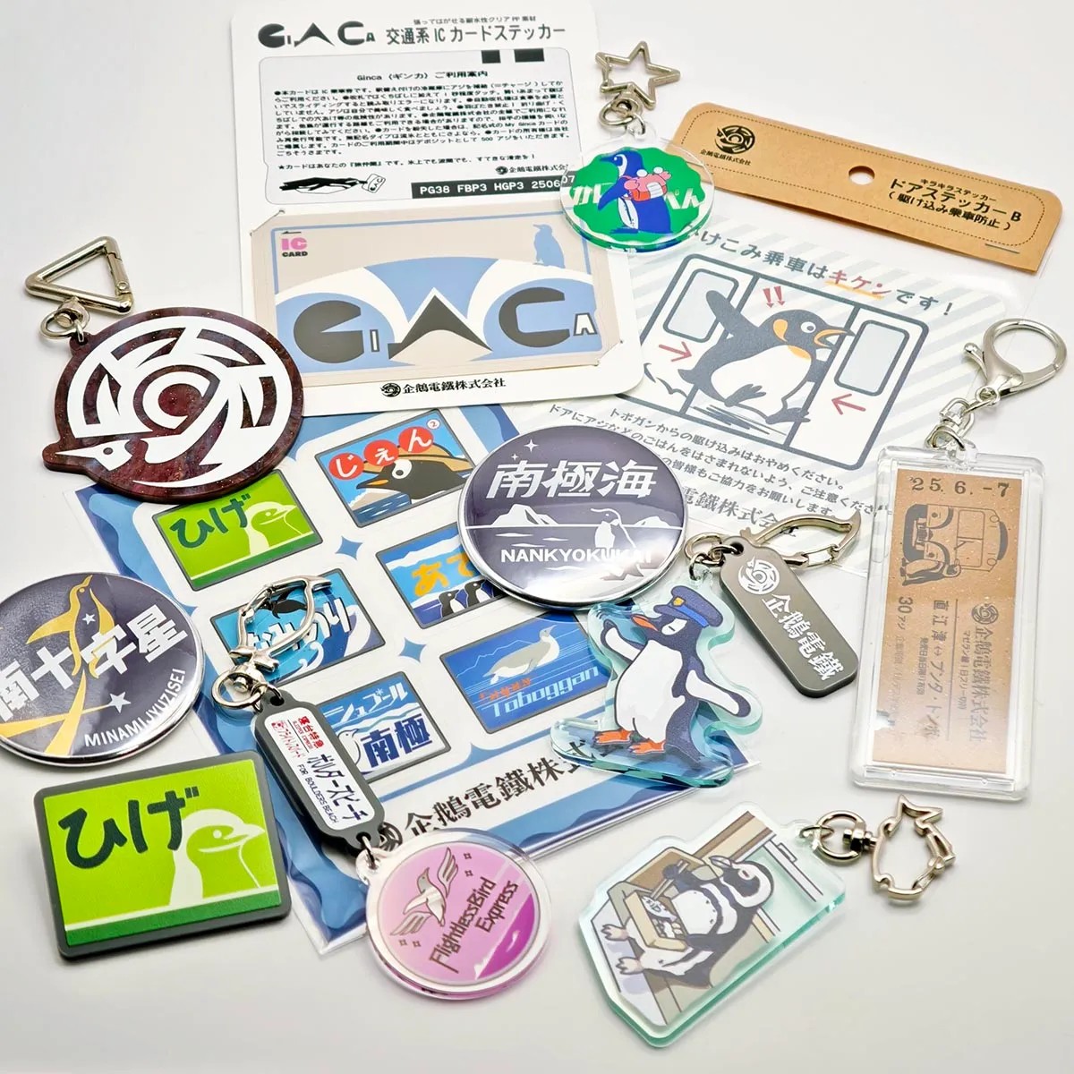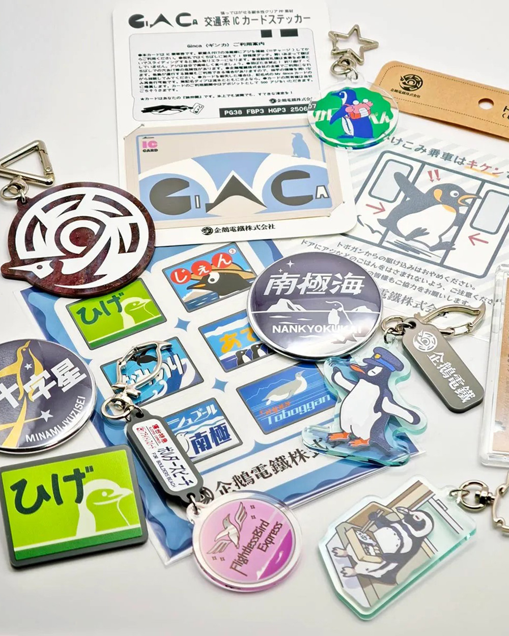 鉄道や銭湯など、そこで人のよう暮らすペンギンさんをイメージしたアクリルキーホルダーや缶バッジなどの普段使いしやすい雑貨を展開しています。