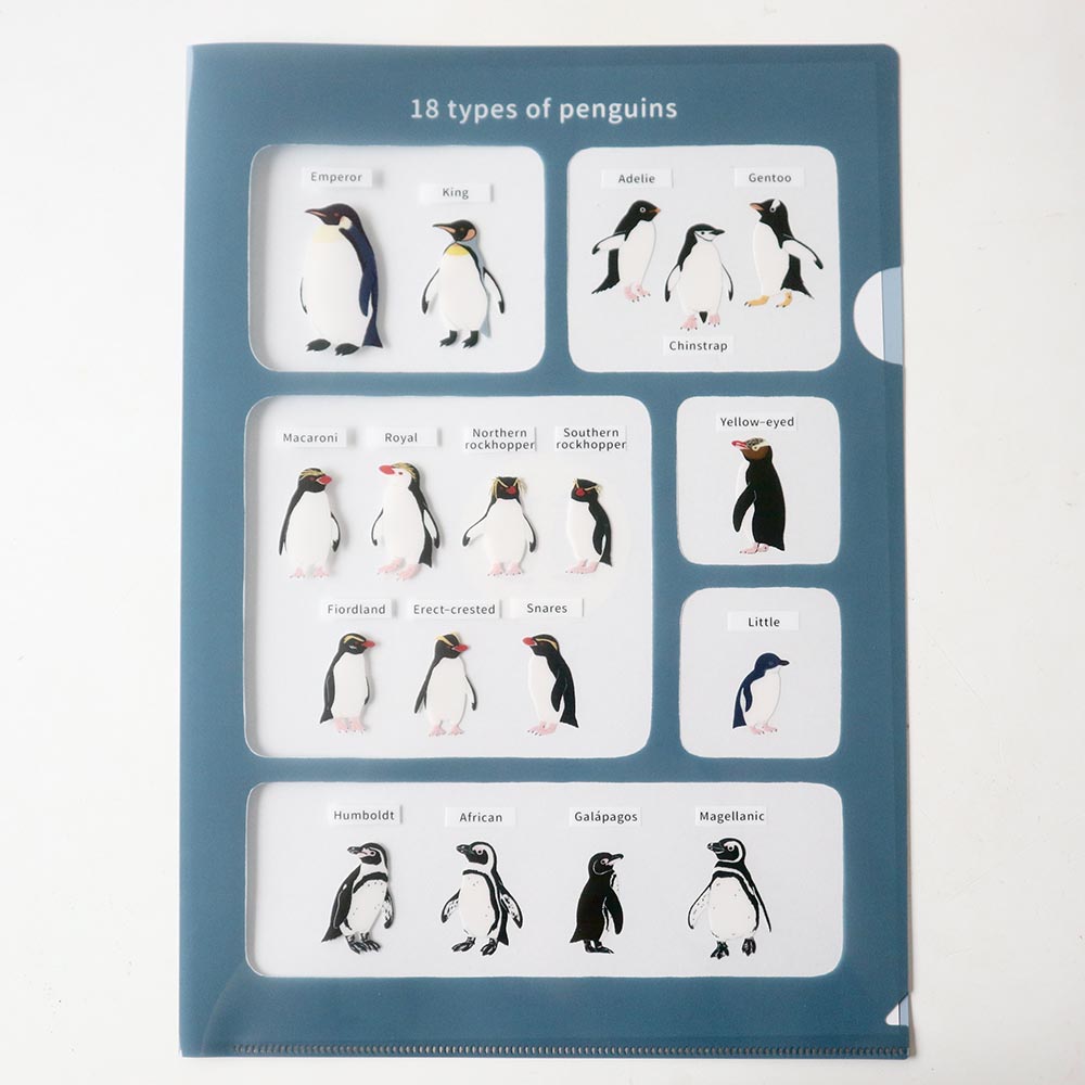 ペンギン18種の分類が分かるA4クリアファイルです。