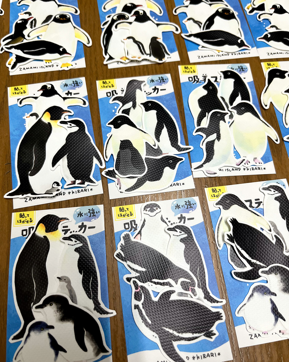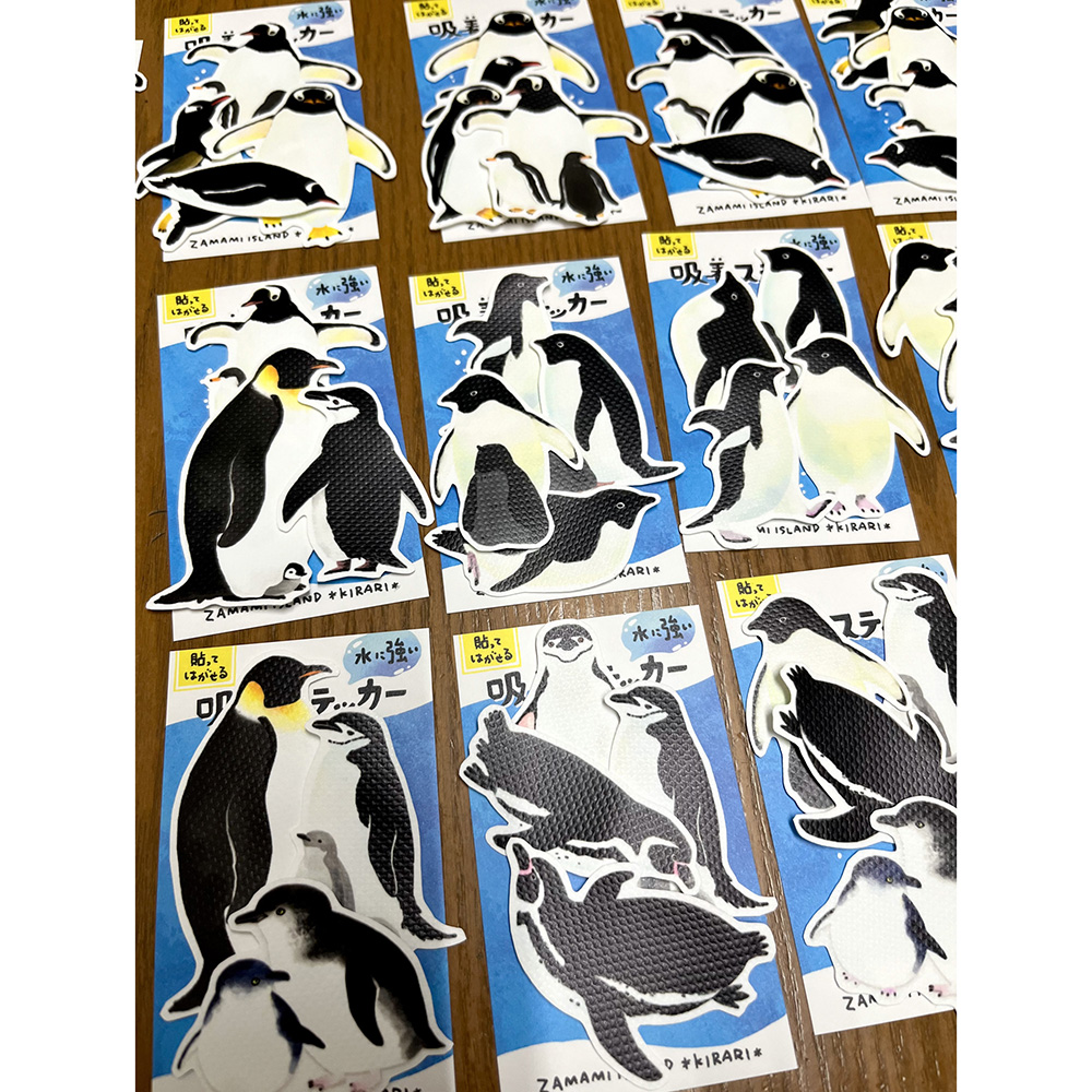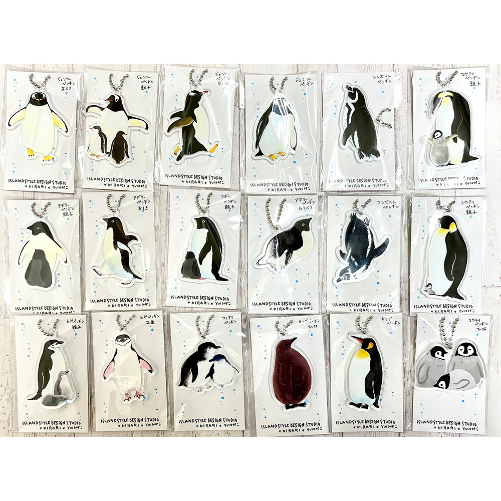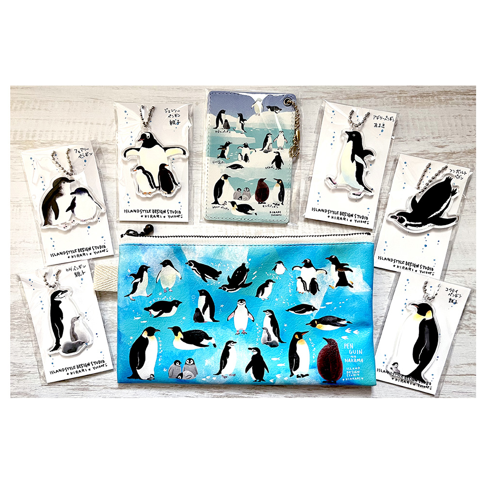 アクリルキーホルダー、吸着ステッカー、下敷き、クリアファイル、ポーチ、パスケース、巾着など製作します。 ジェンツー・アデリー・フンボルト・キング・コウテイ・フェアリー・ヒゲなどなどなるべく多彩なペンギンたちと、海のいきものたちをたくさん連れて行きます。