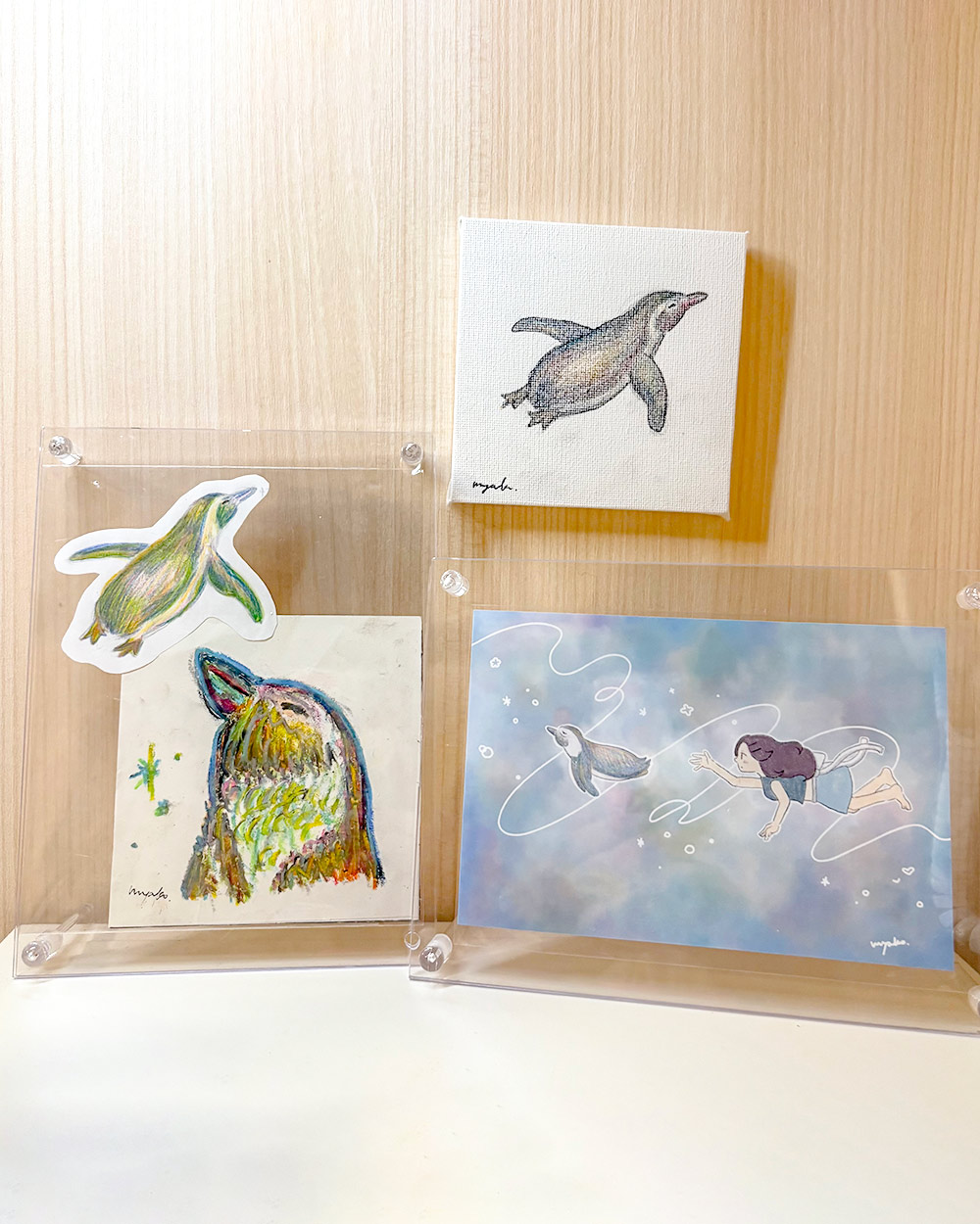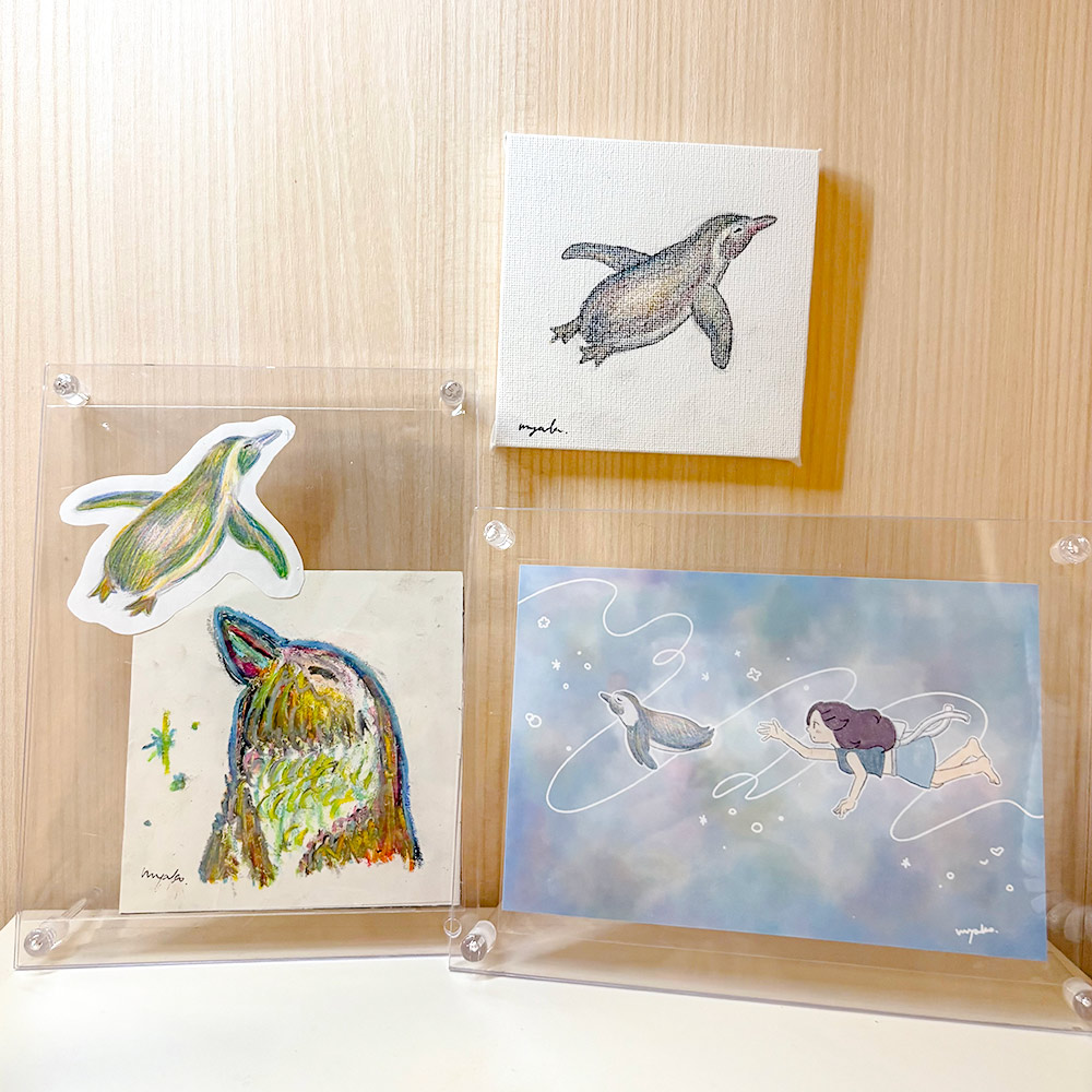 白黒のイメージが強いペンギンを、色鉛筆の繊細な色の重なりでカラフルに表現しています。 イラストやポストカード、キーホルダーなどの雑貨は、日常に彩りとペンギンを添えるような作品となっております。