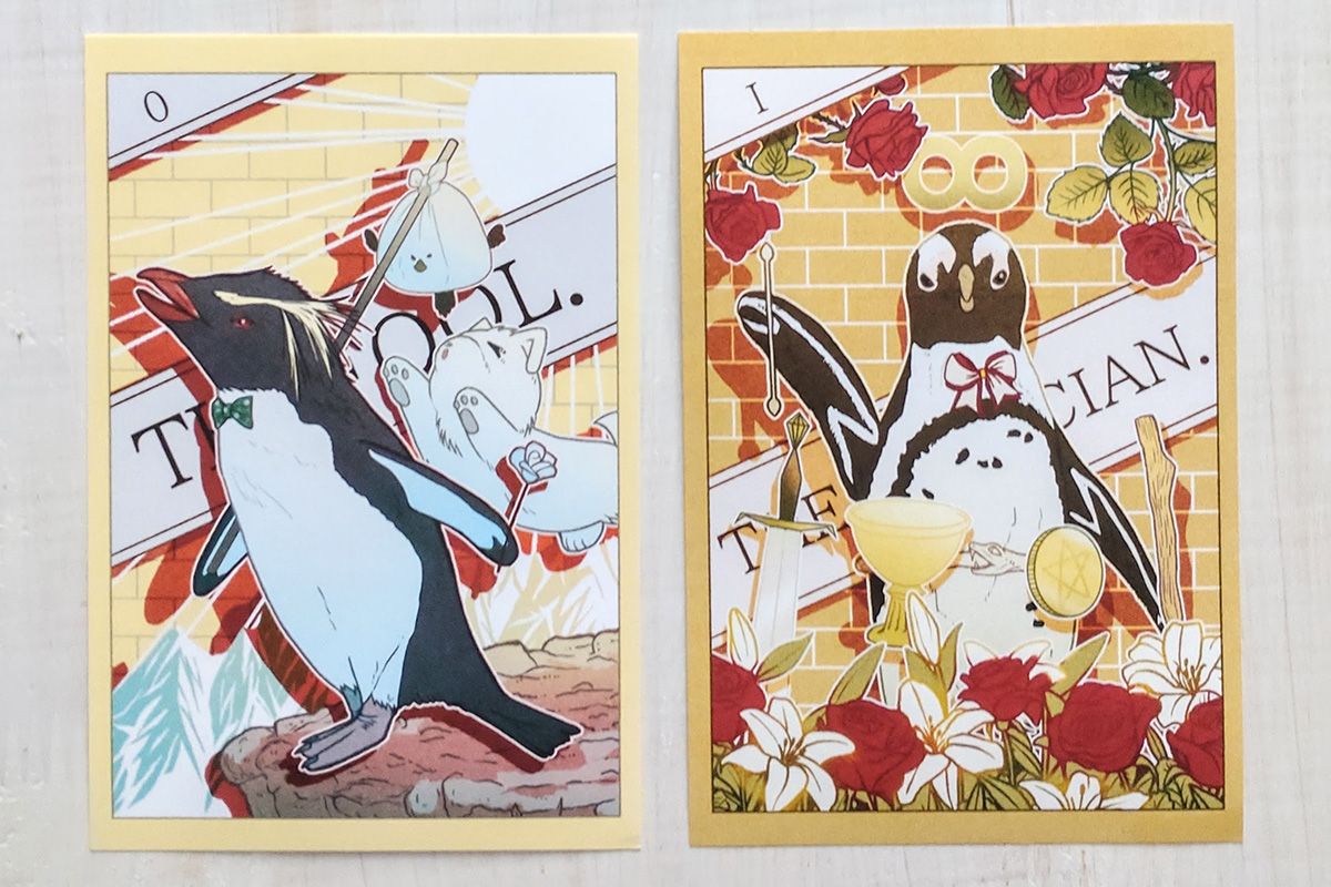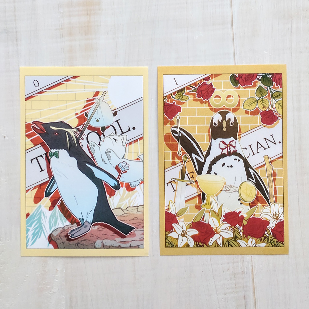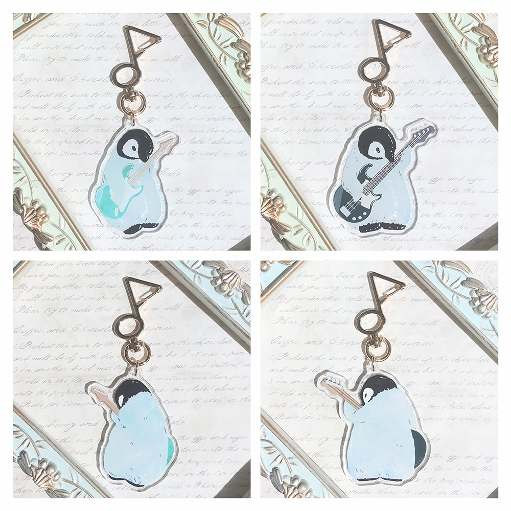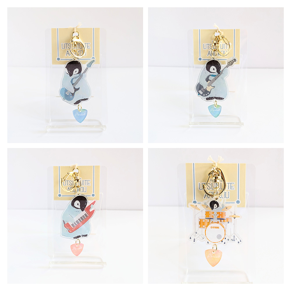 ポストカードやステッカー、うつむいているコウテイペンギンのオリジナルキャラクター「きょうめちゃん」のハンドメイドキーホルダー、アクリルキーホルダーなどです。